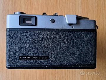 Fotocamera Canon Canodate E analogica (circa 1970, prima versione) in buone condizioni. Macchina fotografica rara. Obiettivo 40 mm, f/2,8. Otturatore Seiko. Questa è una fotocamera completamente automatica, il che significa che imposta l'apertura e la velocità dell'otturatore. Devi solo mettere a fuoco utilizzando la messa a fuoco del telemetro a doppia immagine. L'obiettivo ha un bell'aspetto e nel complesso è una fotocamera pulita con pochi segni di normale utilizzo. La spia di controllo della batteria non si accende: mancano le pile, per cui non sono stato in grado di verificarne il funzionamento. Copriobiettivo in plastica Canon e borsa originale in cuoio incluse.