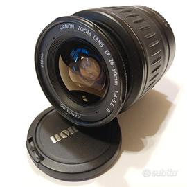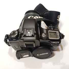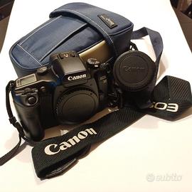 Impossibile elencare tutte le caratteristiche di questa fotocamera analogica CANON EOS 33 cui si aggiunge un generoso zoom Canon EF 28-90 Macro (38cm.) ed un marsupio con tasca interna per alloggiare il tutto. Completa di tracolla originale CANON EOS.