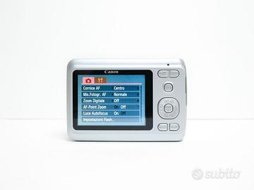 Fotocamera compatta digitale Canon PowerShot A480, con nessun problema funzionale o danno estetico. Obiettivo senza righe/segni e senza polvere interna. Piccolissimi segni di normale uso sulla scocca e display, non influenti nell’utilizzo o in fotografia (vedi foto per maggiori dettagli sull’estetica del prodotto). Si alimenta con 2 classiche batterie stilo AA (non presenti). Colore: grigio. Comprensiva di: Custodia Kodak per il trasporto. Il prodotto è stato testato e la prova del suo funzionamento è disponibile. Tutte le foto dell’annuncio sono scattate da me: il prodotto in vendita è quello che vedi in foto. Compatta tuttofare ideale per la vita di ogni giorno, con look fotografico classico vintage anni 2000. Caratteristiche: Camera autofocus punta e scatta, obiettivo equivalente 37 - 122 mm Sensore 1/2.3” CCD da 10 MP con zoom ottico 3,3x Registrazione video 640 x 480 a 30 fps Velocità otturatore: 15” - 1/2000 ISO: 80 - 1600 Dimensioni: 92 x 62 x 31 mm Powershot IXUS G7x mark II III 285 HS Peso: 140g senza batteria