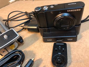 Fotocamera digitale Samsung NV100HD 14MP con comando a distanza, scheda sdhc 8Gb e cavalletto. Caratteristiche Principali Sensore: CCD da 14,7 Megapixel (formato 1/1.72"). Obiettivo: Schneider-Kreuznach con zoom ottico 3.6x, con una focale equivalente a 28-102mm. Display: LCD Touch Screen da 3 pollici con risoluzione di 460.000 pixel, dotato dell'interfaccia "Smart Touch 2.0" che permette il controllo tramite gesti. Video: Registrazione in alta definizione (HD) a 720p (1280x720 pixel) a 30 fps. Stabilizzazione: Doppia stabilizzazione delle immagini (Ottica + Digitale) per ridurre le sfocature.