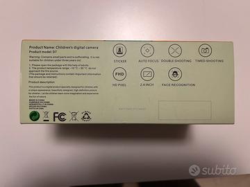 Fotocamera digitale da 24mp con videocamera e LCD da 2.4 pollici. Contenuto della confezione: 1 fotocamera digitale per bambini. 1 cavo dati USB. 1 adattatore usb con lettore di schede 1 cordino di sicurezza. 1 scheda di memoria da 32 GB (già inserita nella fotocamera). 1*Manuale in italiano 1 cartoncino con sticker
