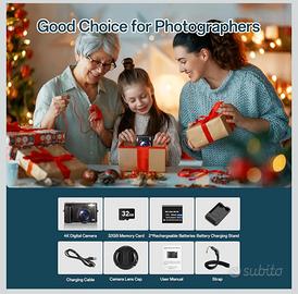 Fotocamera Digitale 4K,48MPAutofocus Macchina Fotografica con Zoom16X, Vlog Fotocamera Compatta HD con Stazione di Ricarica, 2 Batterie da 800 mAh, Scheda da 32 GB per Principianti, Bambini