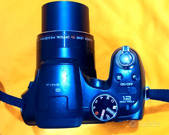 Fotocamera digitale bridge Fujifilm FinePix S1900 12mp obiettivo 28-420 mm zoom ottico 18X digitale 6,3x messa a fuoco macro da 2cm tempi da 2s a 1/2000s iso 64-6400 dimensioni molto compatte, alimentazione 4 pile AA (non fornite) , completa di tappo obiettivo e cighia tracolla. Fotocamera in ottime condizioni estetiche, display LCD in parte rovinato, mirino elettronico perfettamente funzionante (i particolari in foto), le altre funzionalità ok, a parte qualche sporadico falso contatto della rotellina dei programmi , foto perfettamente bilanciate, vendo come parzialmente funzionante o uso ricambi. Solo Spedizione Prezzo Non Trattabile No Resi