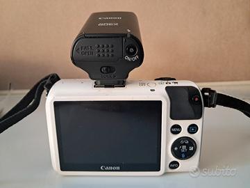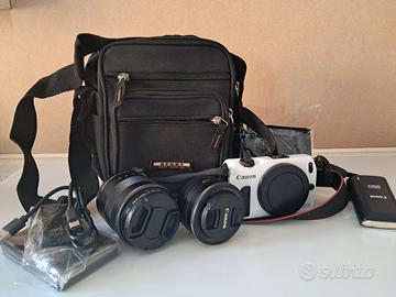 kit completo canon M mirrorless anno 2015 composto da corpo fotocamera, flash spedite 90ex, 2 obiettivi zoom ef-m 18-55mm f.3,5-5,6+ grandangolo 22 mm f. 2 stm filtro uv 390 hama batteria lp-e12 e caricabatteria nuovi borsa per il trasporto. poco usata, in perfette condizioni e funzionante. peso 298 gr. misura 108x66x32