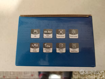 Fotocamera Digitale compatta 4K 48MP con schermo ribaltabile da 3 pollici a 180°, auto focus, zoom digitale 16X e anti-shake. Video 4K Hd e foto 48MP ad alta risoluzione e modalità di scatto avanzate. Sono incluse 2 batterie ricaricabili e una scheda di memoria da 32GB per iniziare subito.