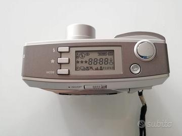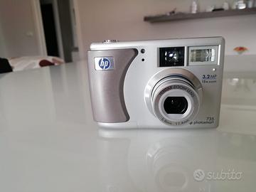 Fotocamera digitale HP Photosmart 735, comprensiva di cavetto di collegamento USB al PC, scheda di memoria, carica batterie per batterie ricaricabili e manuale di istruzione cartaceo o Pdf, come si preferisce. La fotocamera si può usare con batterie AA ricaricabili, ottima ottica, registra foto e video.