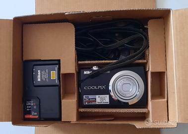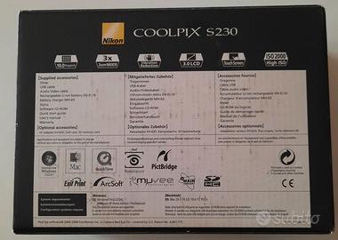 Fotocamera digitale NIKON COOLPIX S230. Fotocamera digitale in confezione originale, dotata di software, cavo alimentazione, batteria ricaricabile originale Nikon, Sandisk da 2 Gb. non funziona il touch screen del video, leggermente incrinato.
