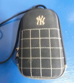 Fotocamera digitale compatta argento con custodia e memory card da 2 gb.