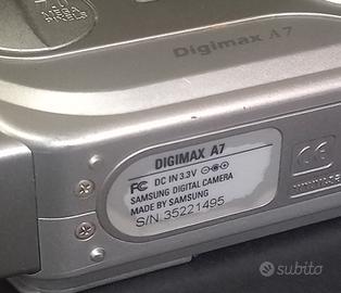 Samsung Digimax A7è una fotocamera digitale compatta con le seguenticaratteristiche principali: Specifiche Tecniche Risoluzione Immagine:7.0 Megapixel effettivi grazie a un sensore CCD da 1/1.8". Zoom: Ottico:3x. Digitale:5x. Lunghezza Focale:equivalente a 7.7 - 23.1 mm. Scheda di memoria: Sd Video:Capacità di registrazione video MJPEG a 30 fotogrammi al secondo. Macro:Messa a fuoco macro fino a 4 cm. Alimentazione:Utilizza due batterie stilo AA. Display:Schermo LCD da 2 pollici. Funzionalità Aggiuntive:Include la registrazione vocale e il supporto PictBridge per la stampa diretta. FUNZIONANTE COME NUOVA