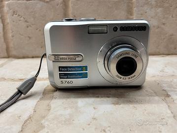 Fotocamera digitale Samsung S760, 7.2 Megapixel, zoom ottico 3x, stabilizzazione dell'immagine, include la funzione di face detection, display da 2.4" (6,1 cm), utilizza batterie AA. Perfettamente funzionante, parte anteriore leggermente rovinata come visibile in foto. Colore argento.