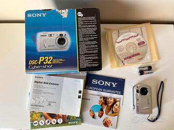 Fotocamera digitale vintage SONY DSC-P32 Cyber-shot funzionante, con 3 Memory Stick, software, scatola e manuali originali.