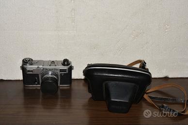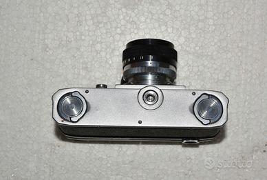 Fotocamera a telemetro sovietica Kiev 4 con obiettivo 53mm f/1.8. La fotocamera si trova in ottime condizioni estetiche ed è perfettamente funzionante in tutte le sue parti: tempi precisi…….., tendine perfette, mirino pulito, luminoso ed accoppiato. L’autoscatto non funziona. Anche l’obiettivo si trova in ottime condizioni, con lenti privi di graffi, di opacizzazioni, di muffe ed è irrilevante la presenza di polvere al suo interno. Regolare è la selezione dei diversi diaframmi (da f/1.8 a f/22). Nella proposta di vendita è compresa la borsa originale ed il tappo dell’obiettivo. Altre immagini a richiesta degli interessati.