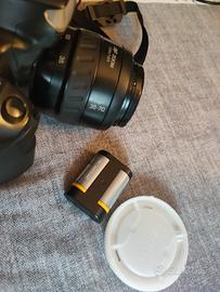 Fotocamera Minolta Reflex Dinax 300si con la sua custodia. Libretto di istruzione e pile annesse. È in ottimo stato.