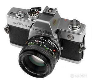 macchina fotografica Minolta SR T100× (1977) vintage con custodia in pelle nera tenuta maniacalmente nel corso degli anni. Macchina da collezione, per appassionati di fotografia su pellicola e del vintage.