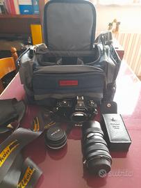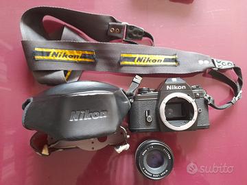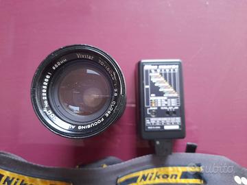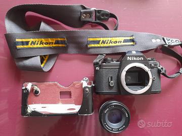 Reflex NiKon EM con obiettivo originale Nikon 50mm 1:1.8 serie SE + flash originale SB-E + obiettivo Vivitar 70-150mm + borsa.