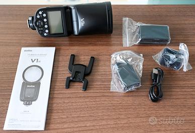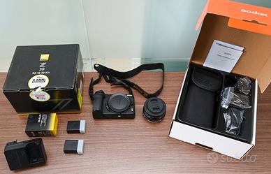 Fotocamera mirrorless Nikon Z30, completa di obiettivo Nikkor Z DX 16-50, flash Godox V1N, caricabatteria e batteria supplementare.