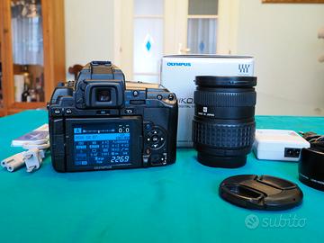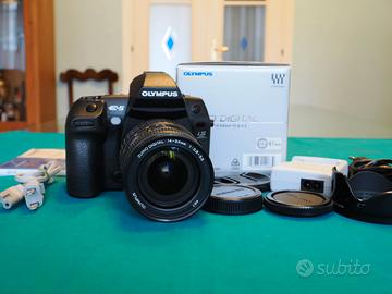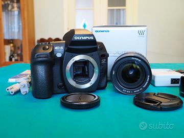 Vendo fotocamera Olympus E5, sistema 4/3, con obiettivo Zuiko 14-54 mm, F 2,8-3,5 con tappi e paraluce originali. Come da immagini la fotocamera è corredata di tappo bocchettone, caricabatteria e batteria Olympus, NO scatola, NO tracolla. La fotocamera ha il flash incorporato, peso totale con ob. grammi 1360. Eseguiti 13000 scatti. Corpo macchina come nuovo, obiettivo ha la ghiera dello zoom con segni di usura dovuti al utilizzo, lenti perfette.