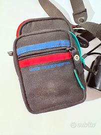 fotocamera compatta Olympus Superzoom 800, dotata di obiettivo zoom 38-80mm e autofocus, accompagnata dalla sua custodia originale firmata United Colors of Benetton, caratterizzata dai tipici colori vivaci del brand e in ottime condizioni di conservazione.