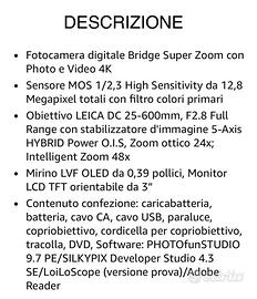 Vendo fotocamera panasonic lumix fz300 usata pochissimo e in ottime condizioni nemmeno un graffio. In pratica come nuova, Funzionante al 100% disponibile anche a farvela visionare di presenza . Ha un superzoom veramente eccezionale. Fa foto e video anche in 4k . Possiedo tutto scatola caricabatterie memoria . Se volete posso anche spedire ma a carico dell’acquirente. Vendo solamente perché non la uso quasi mai. L’articolo si trova in zona Trapani