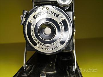 In buono stato, si tratta di una fotocamera degli anni ’40 prodotta dalla Coronet Camera di Birmingham tra il 1930 e 1950, completa di custodia originale in pelle e flessibile per lo scatto.