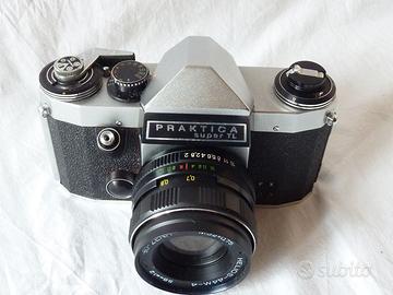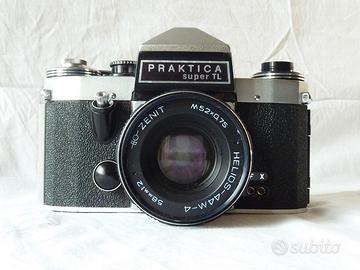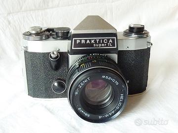fotocamera Praktica con obbiettivo a vite Zenit, fotocamera reflex provata, senza rullino, funzionante con tempi giusti. Con custodia in pelle originale.