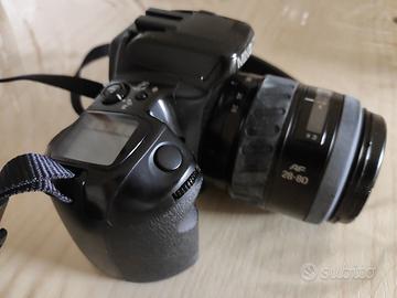Fotocamera reflex analogica Minolta Dynax 500si + obiettivo Minolta AF 28-80 mm 1:4 (22) - 5.6. Corpo, zoom, 5 programmi, flash a scomparsa, copri obiettivo. Funzionante e in buone condizioni, minimi segni d’uso. Custodia in tessuto con tracolla. Condizioni come da foto, no batteria, no pellicola.