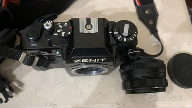 fotocamera reflex analogica Zenit 122 con obiettivo Helios-44M-6 58mm f/2. Con flash elettronico sovietico portatile, probabilmente un modello