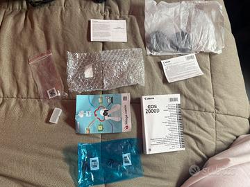 fotocamera reflex Canon EOS 2000D con obiettivo EF-S 18-55mm incluso nel kit. Nuova. comprese tutte le cose che ci sono nelle foto + caricatore batteria e scheda SD. COMPLETA