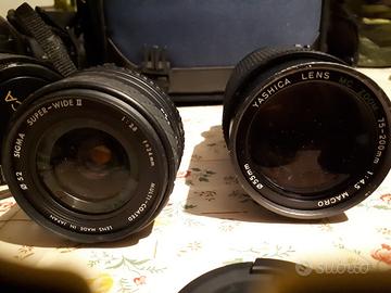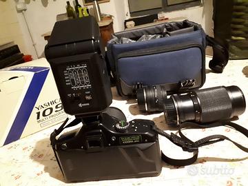 Fotocamera dotata di: obiettivo yashica 35-70, tele 75-200 yashica e obiettivo Sigma 24 mm. Inoltre dotata di flash, custodia macchina fotografica ancora nella sua scatola originale mai usata e borsa. Ho testato la macchina ed il flash con le pile e sembra funzionare tutto. La macchina e gli accessori sono venduti come visti e piaciuti senza possibilità di reso. La macchina ha qualche segno del tempo ma è in buone condizioni generali