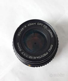 -obiettivo SMC Pentax-M 1:1.7 50mm (da rivedere in quanto le lenti sono sporche dalla parte interna e andrebbero ripulite) senza copri-obiettivo.