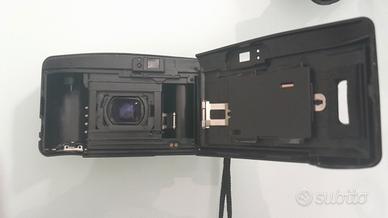 Fotocamera Samsung analogica (richiede un rullino) in buono stato, alimentata a batteria, presenta una crepa sul display superiore.