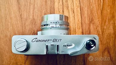 fotocamera a telemetro Canon QL17 Canonet, obiettivo 45 f:1.7, condizioni estetiche ottime, completamente revisionata, perfettamente funzionante. Obiettivo splendido, luminoso senza difetti. Completa di custodia in pelle