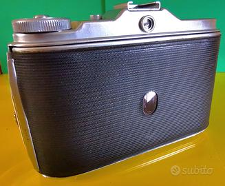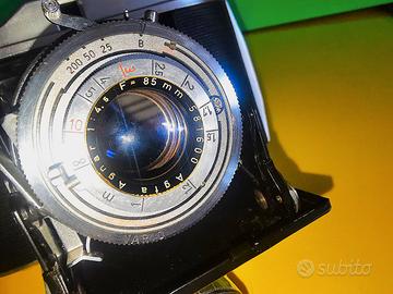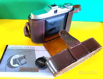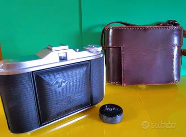 Bellissima fotocamera a soffietto per medio formato, pellicola 120mm, negativi 6x6cm, marca AGFA Isolette V, perfettamente funzionante, testata con pellicola, completa di custodia originale in vero cuoio perfettamente conservata e funzionale. Luminoso e pulito l'obbiettivo Agnar 85/4,5 restitusce negativi incisi e contrastati. Presa PC per flash sincronizzato su tutti i tempi di scatto, soffietto integro senza infiltrazioni di luce, manuale d'uso, tappo copriobbiettivo e slitta portaccessori e flash. Perfetta (Vedi foto) da usare. Dalla mia collezione Colore Nero