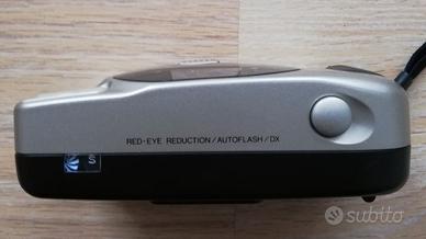 Fotocamera vintage Minolta F25, fuoco fisso per pellicola 35mm e ripresa puntiforma 35mm. La fotocamera è dotata di un obiettivo grandangolare da 35 mm f/6,3. Velocità dell'otturatore: 1/125 sec. Funzione di riduzione occhi rossi. Distanza minima di messa a fuoco 1,3 m.
