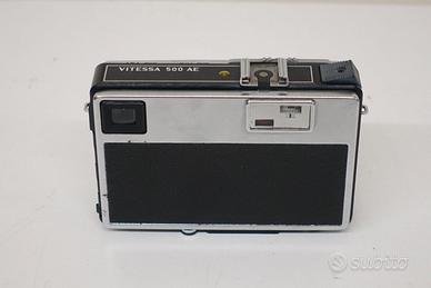 Macchina Fotografica analogica a rullino Zeiss Ikon Voigtlander VITESSA 500AE, funziona con normale rullino pellicola 35mm, alimentazione n.2 batterie a bottone per elettronica, slitta per flash, obiettivo Color-Lanthar. 42mm f/2.8. Buone condizioni generali, qualche segno di usura, otturatore ok, leva di ricarica ok, elettronica ok, ghiere ottica fluide.