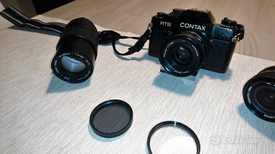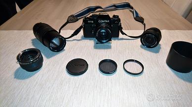 2 corpi macchina I e II serie con obiettivo Zeiss 50mm, grandangolo Yashica 28mm., zoom Sigma 70/210mm., duplicatore di focale, borsa fotografica. Tutto in blocco o separatamente.