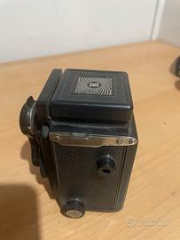 Fotocamera TLR (Twin-Lens Reflex) vintage Kingston Reflex, prodotta a Hong Kong. Le fotocamere TLR utilizzano un sistema a doppio obiettivo, uno per la visualizzazione e la messa a fuoco e l'altro per scattare la fotografia. Questo modello offre un'interfaccia intuitiva con controlli frontali. Doppio obiettivo frontale: L'obiettivo superiore è etichettato "Double Lens Reflex", mentre quello inferiore è indicato come "Plasticion Lens".