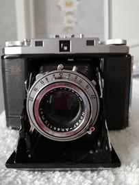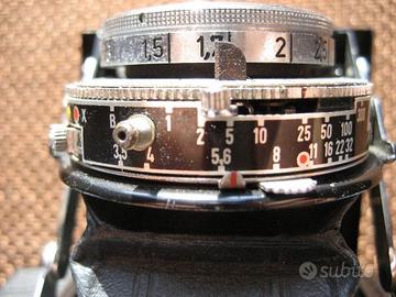 Fotocamera folder Zeiss Mess Ikonta 524/16 formato 6x6 prodotta tra il 1954 / 1955 , dotata di telemetro a sovrapposizione non accopiato , monta un otturatore Prontor con tempi sino al 1/300 e un obiettivo Novar Anastigmat f/3,5 - 75 mm. La macchina si presenta in perfette condizioni estetiche senza graffi e con il rivestimento del corpo non usurato le parti verniciate integre , ogni scritta o scala leggibilissime ; il soffietto non ha abrasioni o usure nei punti di piega ed è impermeabile alla luce , il telemetro e il mirino sono chiari e funzionano egregiamente . Per quanto concerne la funzionalità l'ottica si presenta con lenti limpide , senza muffe o graffi sulle lenti ma la messa a fuoco è un pò pastosa ; i tempi di scatto veloci funzionano mentre i più lenti non concludono lo scatto e questo denota un degrado dei lubrificanti quindi s'intuisce che il complesso obiettivo otturatore abbisogna di revisione ( ma dopo tanti anni di fermo la cosa non meraviglia ) La macchina ha la sua custodia in pelle rigida originale in splendide condizioni € 90 - Si valutano anche proposte serie Contattare Fausto anche in voce o Whatsapp