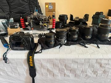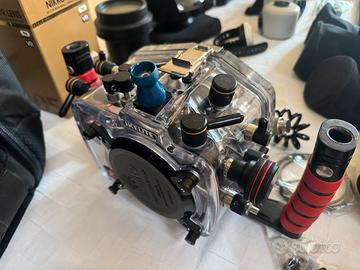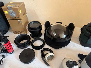 Custodia ikelite per d7000 3 flash serie bracci, dome , prolunghe , macchina fotografica con battery pack più 5 obbiettivi più GoPro 7 black custodia più faro led , torcia ikelite con snodo carica batterie più Zaino, tutto manutentato. Vendo anche separatamente