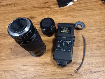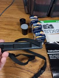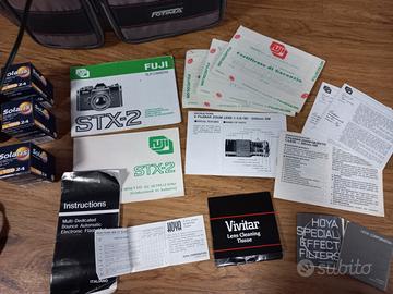 Corpo camera Fuji STX-2; obbiettivo X-Fujinon 1:1.9 f=50 mm; teleobbiettivo X-Fujinar•Z 1:3.8 f=80-200 mm DM; Flash Maxwell DA-5000S Zoom; duplicatore di focale Kenko 2x cfe Teleplus MC7 (non si adatta a questa fotocamera, ma dato in più); Cavo di scatto per lunghe esposizioni; 2 tracolle (Fuji e Fujica); 2 contenitori pellicole vuoti; 3 pellicole Solaris sigillate; Oculare Fuji; Borsa Fotima; certificati garanzia, e istruzioni varie (2 libretti istruzioni fotocamera, istruzioni flash, istruzioni zoom; certificati vari); cartine pulisci-lenti.