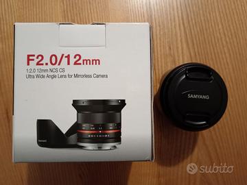 Obiettivo Samyang 12 mm f/2 NCS CS, attacco Fujifilm, con scatola, tappi anteriore e posteriore e paraluce originale. Pari al nuovo.