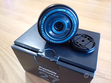 Fotocamera Fujifilm X-T10 con obiettivo Fujinon SUPER EBC XF 27 mm f/2.8. Fotocamera e obiettivo completi di imballaggi originali, cavi, manuali, caricabatterie e 3 batterie, tappi corpo e obiettivo, scatto flessibile dedicato. 6500 scatti.
