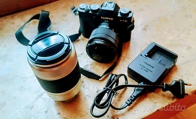 Fotocamera mirrorless Fuji XT10 in buonissime condizioni, poco usata, perfettamente funzionante, completa di scatola originale, corredata da due ottiche come nuove, 16-50mm OIS e 50-230mm OIS,