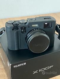 FUJIFILM x100F come nuova! aggiustata e revisionata completamente da FOTOCHECKUP Perugia con pulizia ottiche e sensore, 6 mesi di garanzia sulla revisione e riparazione effettuata come potere vedere da foto allegata. La macchina viene con sua scatola, rivestimento in gomma anti urti, paraluce a cupola, batteria e caricabatteria con doppio slot. Perfettmaente funzionante come nuova, solo quale leggerisismo segno di usura.
