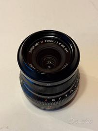 Vendesi Fujifilm Fujinon XF 23 mm f/2 R WR. L'obiettivo è in buone condizioni ed è dotato di un filtro UV sin da quando era nuovo. La consegna include il filtro UV, il paraluce e i tappi di protezione anteriore e posteriore, come visibile nelle immagini; confezione originale non inclusa.