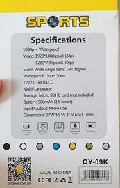 Il prodotto non solo ha un aspetto dinamico ed elegante ma può immergersi fino ad una profondità di 30 metri essendo dotata di un guscio impermeabile che risulta essere la scelta migliore per sport acquatici ed immersioni. Può essere utilizzato inoltre come DVR per auto. Caratterizzata da batteria rimovibile facilmente sostituibile. Apertura grandangolare di 12 megapixel HD 170 gradi Schermo ad alta definizione da 1,5 pollici che visualizza e riproduce l'affascinante registrazione video. Registrazione video durante la ricarica. Uscita HDMI Supporta schede Micro SD (TF) ad alta capacità Fino a 32 GB. (NON INCLUSA). La confezione include: 1 x Mini Sports HD 1 x custodia impermeabile 1 x Cavalletto per biciclette 1 x base fissa 1 x Base per casco 1 x bendaggio 1 x cavo data 1 x manuale 1 x batteria ricaricabile (900mAh)