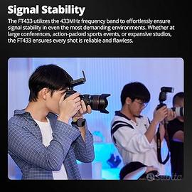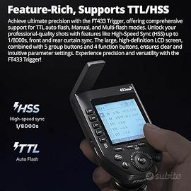 Controllo del segnale a 433 MHz: per soddisfare le richieste di segnale più elevate per i sistemi di controllo, Godox presenta con orgoglio il trigger flash FT433 per migliorare l'efficienza operativa e la precisione. Operando sulla banda di frequenza 433 MHz, questo trigger fornisce funzionalità robuste, con flash automatico TTL e sincronizzazione ad alta velocità (fino a 1/8000s), garantendo prestazioni impeccabili. Compatibile con fotocamere Canon Sony e Nikon, il trigger FT433 con il suo ricevitore FR433 offre affidabilità senza pari nella tua esperienza fotografica professionale. Alimentato da batterie AA facilmente sostituibili, il trigger FT433 è perfetto per l'uso con le unità flash esterne di nuova generazione Godox, tra cui AD200ProII, AD600ProII e AD600BMI. Nuovo mai usato