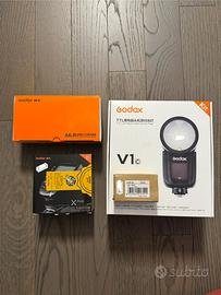 Vendo come da titolo tutto il kit per il godox V1C compreso di radio sincro godox Xpro C smpre per Canon, batteria extra VB26, originale praticamente nuova e AL-R1 kit diffusori. Tutto in ottime condizioni uttilizato vermante poco. Compreso di scatole e istruzioni