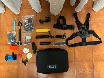 GoPro con la completa gamma di accessori originali di casa madre, come illustrato in foto. Cam praticamente mai usata. Incluse 3 memory disk da 128gb e 32gb e 3 batterie con accumulatore