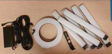 Vendo luce professionale GVM (Great Video Maker) modello 700S da ben 90W (molto più potente delle classiche ring light). È il kit ideale per chi cerca un'illuminazione di alto livello per YouTube, TikTok, ritratti fotografici o lavori di make-up professionale. Grazie alla sua forma a stella con 6 barre LED, crea un riflesso unico negli occhi e una luce diffusa che elimina le ombre dure. Specifiche Tecniche: Potenza 90W: Altissima luminosità regolabile. Bicolore: Passa da luce calda (3200K) a luce fredda (5600K) senza bisogno di filtri. Display Digitale: Per impostare con precisione potenza e temperatura. CRI 97+: Resa dei colori perfetta (fondamentale per video di qualità). Design Modulare: Le barre possono essere rimosse o orientate. Il kit è COMPLETO e comprende: Corpo centrale e 6 barre LED Stativo (treppiede) originale regolabile Supporto per montare Fotocamera o Smartphone Alimentatore originale Borsa da trasporto imbottita GVM Condizioni: Pari al nuovo, utilizzato pochissimo. Tutto perfettamente funzionante.